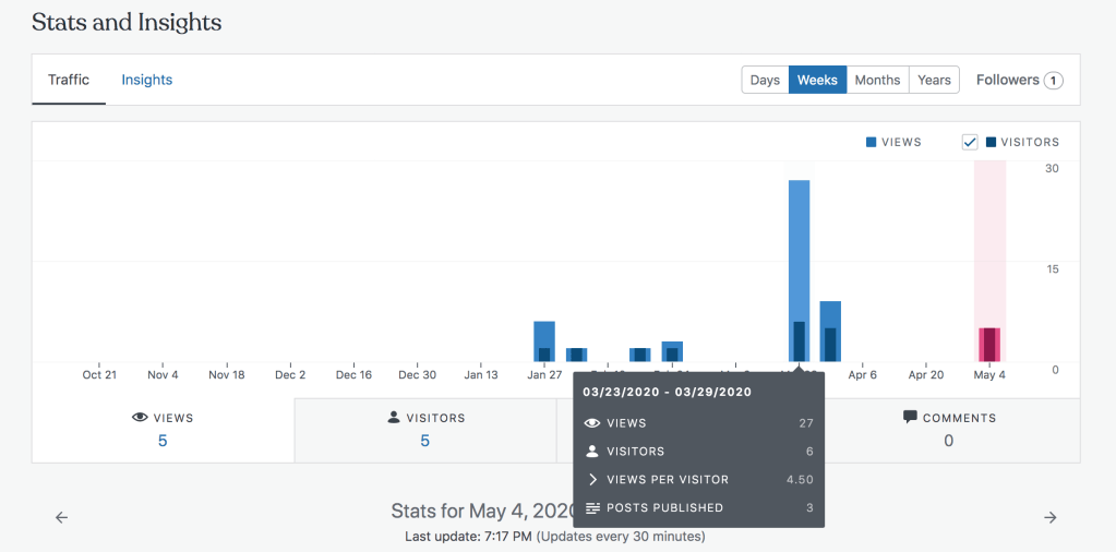 My most popular week on WordPress was the week of 3/23/2020 – 3/29/2020. I had 27 views and six visitors. Yippee!