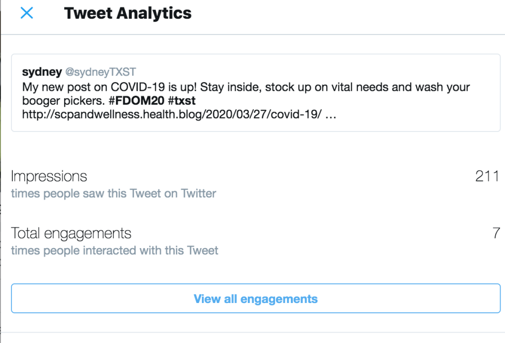 My most popular post of the semester was my post on personal hygiene. This post received ten views and I believe it was popular amongst the audience I reach because due to the situation we are all in, we want to take extra steps to maintain our health.